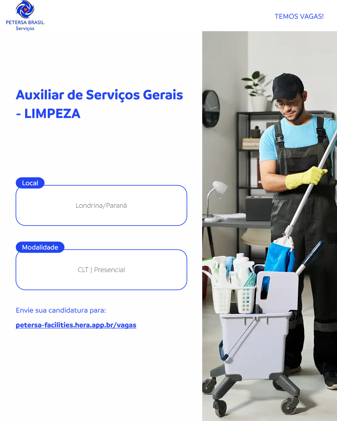 Nós da Petersa Brasil Serviços estamos à procura de um Auxiliar de Serviços Gerais para juntar-se à nossa equipe em atendimento na unidade de nosso cliente para limpeza de uma loja no Shopping.